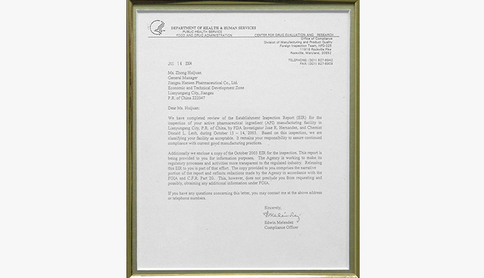 2003公司以“零缺陷”通过美国FDA认证检查,拉开国际化征程的序幕 -