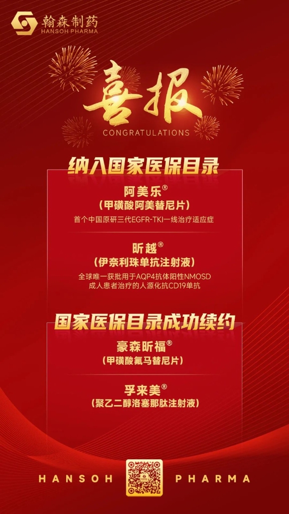 长期以来,翰森制药积极响应国家政策,积极践行企业社会责任,推动创新药进入医保目录,将创新成果惠及更多患者。展望未来,翰森制药将始终聚焦未被满足的临床需求,不断探索生物科技前沿技术领域,推动医药创新高质量发展,用心为患者提供更多新药、好药,为实现“健康中国2030”贡献力量。