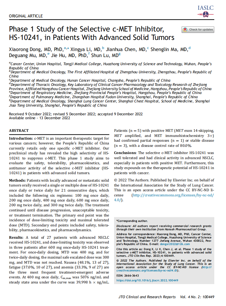 近日,翰森制药自主研发的口服强效、高选择性的小分子肝细胞生长因子受体(c-MET)抑制剂(研发代号:HS-10241),在晚期非小细胞肺癌(NSCLC)人群中的单药I期临床研究结果在国际期刊《JTO Clinical and Research Reports》上发表,有望为表皮生长因子受体酪氨酸激酶抑制剂(EGFR TKI)耐药的晚期NSCLC患者带来新的治疗希望。