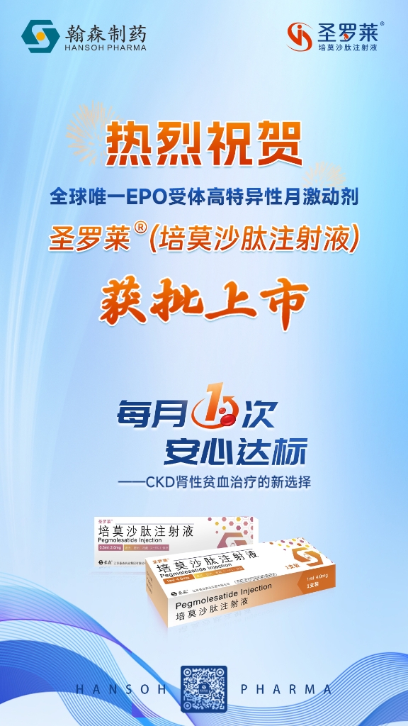 6月30日,翰森制药“全球唯一EPO受体高特异性小多肽月激动剂”圣罗莱®(培莫沙肽注射液)获国家药品监督管理局(NMPA)批准上市,适用于治疗因慢性肾脏病(CKD)引起的贫血,包括未接受红细胞生成刺激剂(ESA)治疗的成人非透析患者,及正在接受短效促红细胞生成素(EPO)治疗的成人透析患者。圣罗莱®成为翰森制药获批上市的第7款创新药。