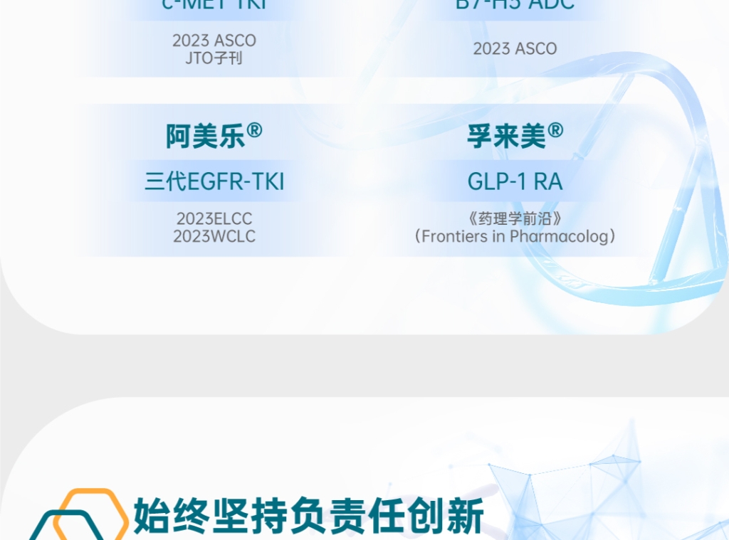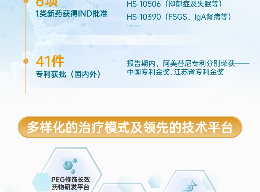 翰森制药始终聚焦未被满足的临床需求,不断探索生物科技前沿技术领域,通过基础创新、产品组合创新等形成全方位、多元化、差异化管线覆盖,利用优势技术平台,持续为患者研发创新优效治疗方案。