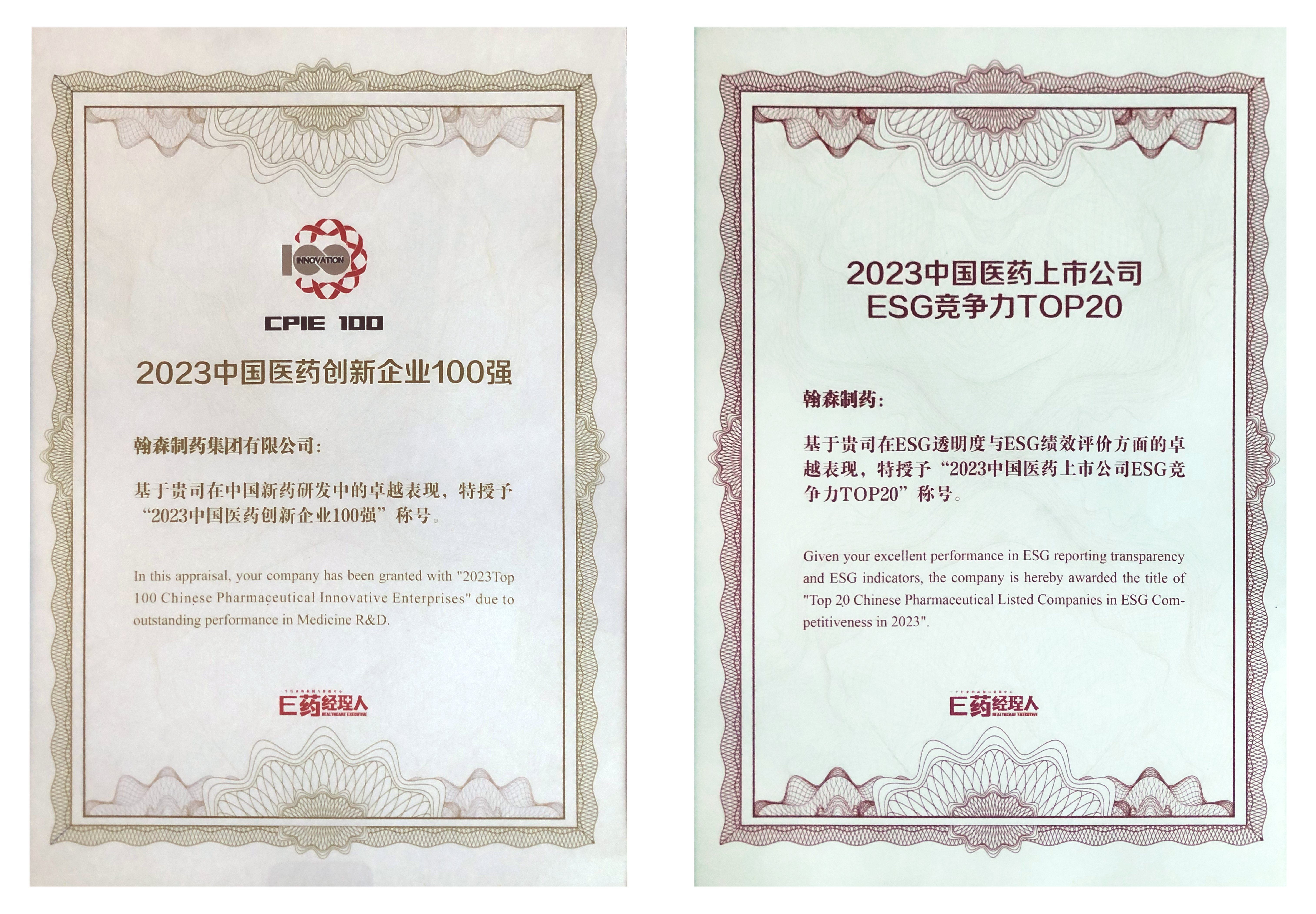 大会隆重发布了2023中国医药创新100强榜单、中国医药上市公司ESG竞争力系列榜单,公司继续位列2023中国医药创新100强第一梯级,并荣获中国医药上市公司ESG竞争力TOP20(大盘股)荣誉,彰显了产业对翰森制药科技实力和负责任创新的高度评价。