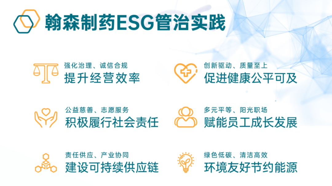 翰森制药始终坚持将ESG理念与公司经营深度融合,在不断为患者带来突破性创新疗法的同时,积极对标学习国际ESG先进经验,承担社会和环境责任,推动ESG卓越发展。