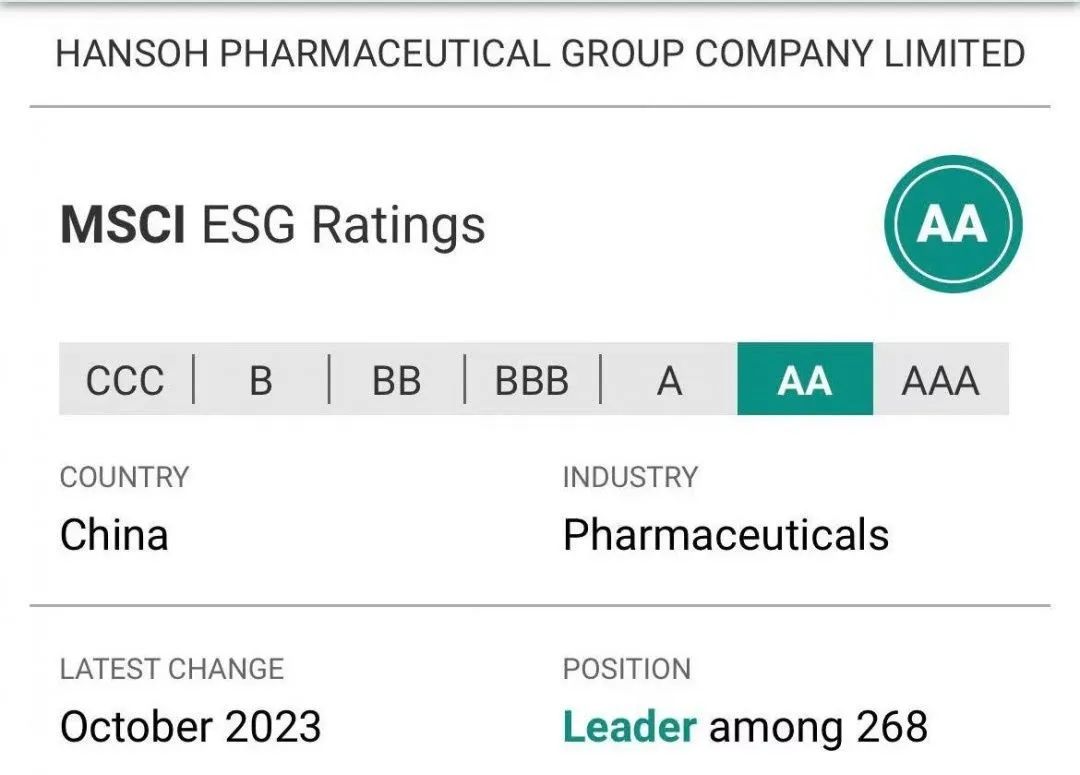 喜讯!翰森制药MSCI ESG评级跃升至AA级,达到全球同行领先水平
