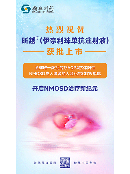 近日,翰森制药集团有限公司(以下简称“翰森制药”或“公司”)创新生物药昕越®(伊奈利珠单抗注射液)获得国家药品监督管理局(NMPA)批准上市,用于“抗水通道蛋白4(AQP4)抗体阳性的视神经脊髓炎谱系疾病(NMOSD)成人患者”的治疗。截至目前,昕越®成为翰森制药获批上市的第六款创新药。